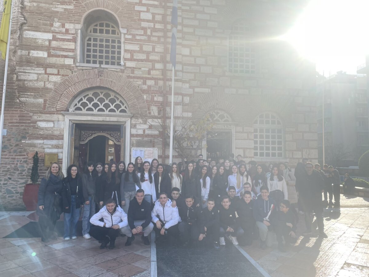 Την Παρασκευή 19 Δεκεμβρίου οι μαθητές της Γ’ Γυμνασίου και οι συνοδοί καθηγητές πραγματοποιήσαμε μια υπέροχη ημερήσια εκδρομή στη στολισμένη Θεσσαλονίκη, συνδυάζοντας τη γνώση και την ψυχαγωγία. Το ταξίδι μας ξεκίνησε νωρίς το πρωί με ενθουσιασμό και πρώτη στάση τον επιβλητικό Ιερό Ναό του Αγίου Δημητρίου. Εκεί, με κατάνυξη και ηρεμία είχαμε την ευκαιρία να προσκυνήσουμε τα ιερά λείψανα του πολιούχου της Θεσσαλονίκης, να θαυμάσουμε την αρχιτεκτονική του ιστορικού ναού και να κάνουμε μία σύντομη περιήγηση στις κατακόμβες , τον τόπο όπου φυλακίστηκε και μαρτύρησε ο Άγιος Δημήτριος.