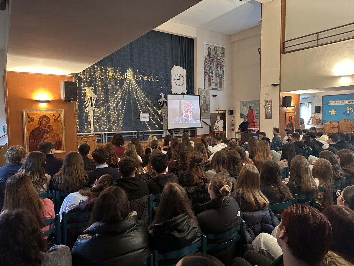 Η ομιλία του πατρός Βησσαρίωνα Αγορίτσα, θεολόγου του Σχολείου, μας ενέπνευσε και μας δίδαξε, ενώ η προβολή της ταινίας μικρού μήκους του Θοδωρή Παπαδουλάκη, «Οι Επισκέπτες», μας συγκίνησε βαθιά, μεταδίδοντας το διαχρονικό μήνυμα ότι η αγάπη και η αλληλεγγύη προς όλους τους ανθρώπους, ανεξαρτήτως καταγωγής, θρησκείας και φυλής, είναι το αληθινό νόημα των Γιορτών .