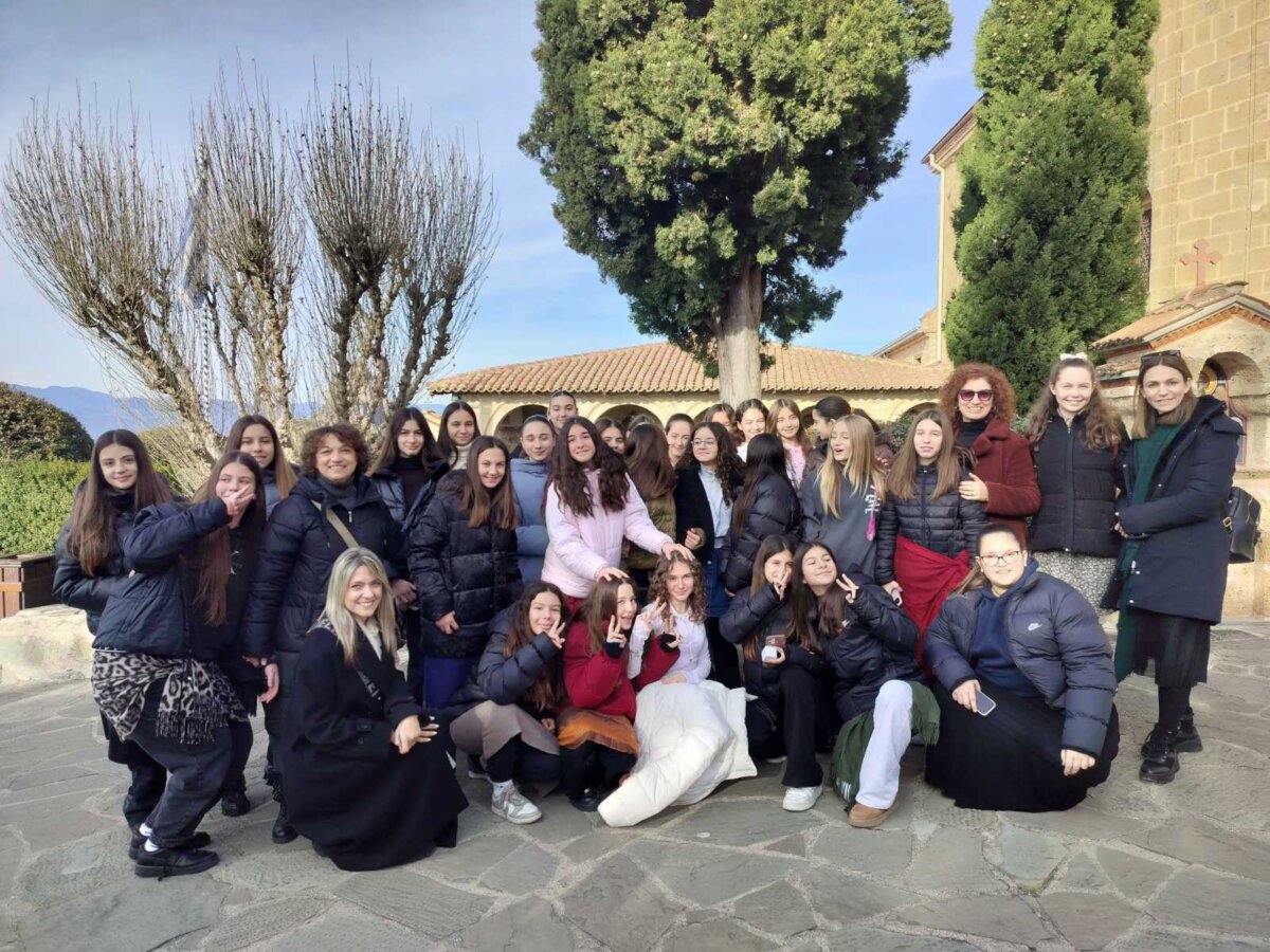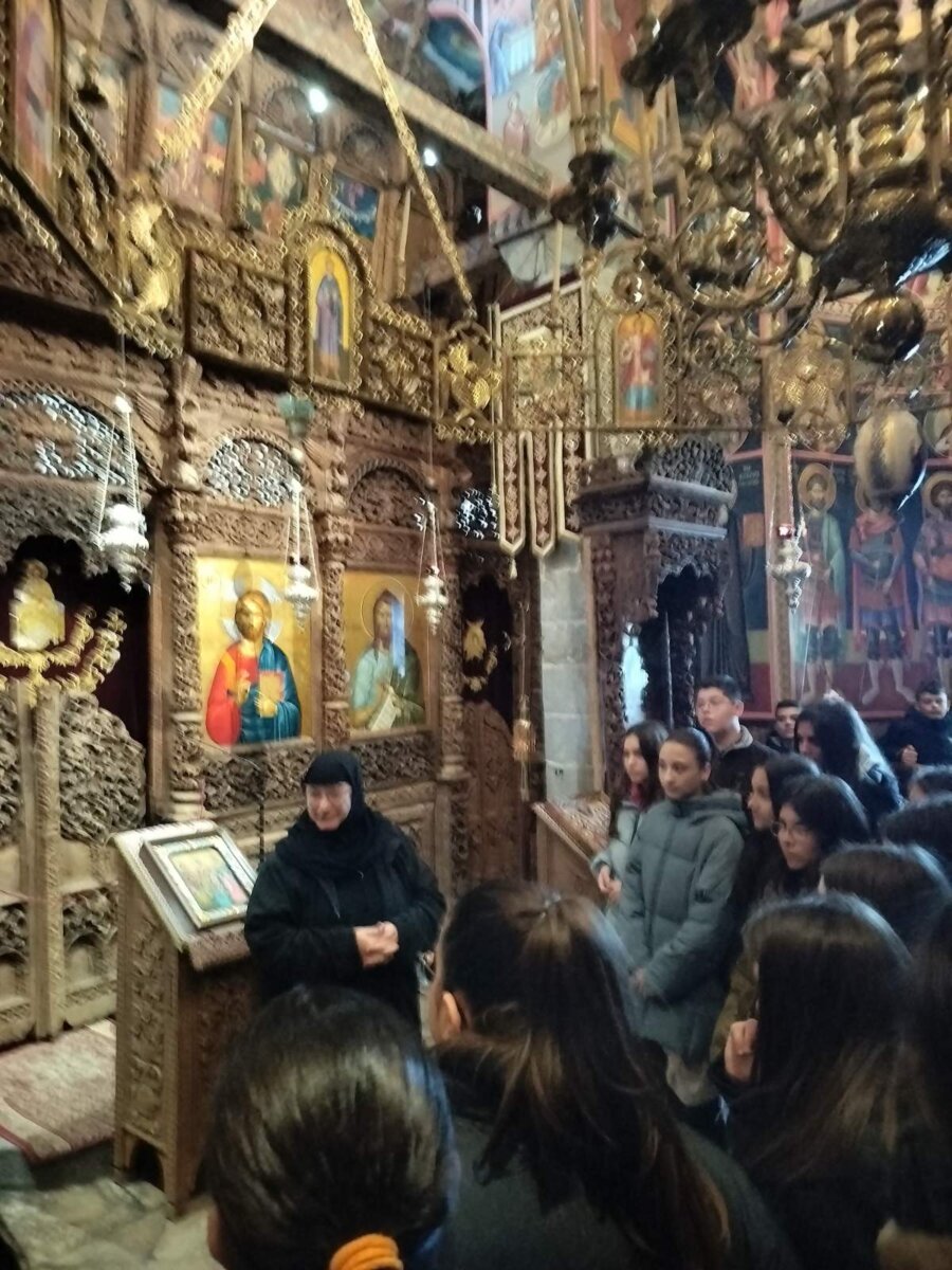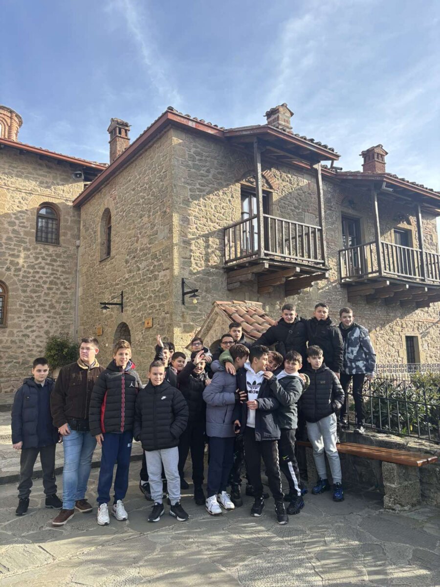 Πρώτος σταθμός η Ιερά Μονή Αγίου Στεφάνου στα Μετέωρα, όπου οι μαθητές είχαν την ευκαιρία να γνωρίσουν από κοντά ένα μοναδικό μνημείο της παγκόσμιας πολιτιστικής κληρονομιάς, θαυμάζοντας το επιβλητικό φυσικό τοπίο και μαθαίνοντας για την ιστορία και τη σημασία του μοναχισμού στην περιοχή. Η μοναχή που μας υποδέχτηκε μας μίλησε με πολύ ζήλο και μεταδοτικότητα για την ιστορία του μοναστηριού, το βίο και τα μαρτύρια του Αγίου Χαραλάμπους και έδωσε συμβουλές ζωής στα παιδιά μας.